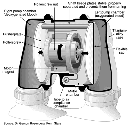 Das Penn State Total Artificial Heart (TAH) wird von einem Elektromotor angetrieben. Der Motor dreht eine Rollenschraubenmutter, die die Rollenschraube zur Seite drückt. Der Motor ändert die Polarität alle viereinhalb Umdrehungen, wo durch die Rollenschraube in die entgegengesetzte Richtung bewegt wird. Diese Hin- und Herbewegung innerhalb des künstlichen Herzens erzeugt eine Pulsation wie im echten Herz.
